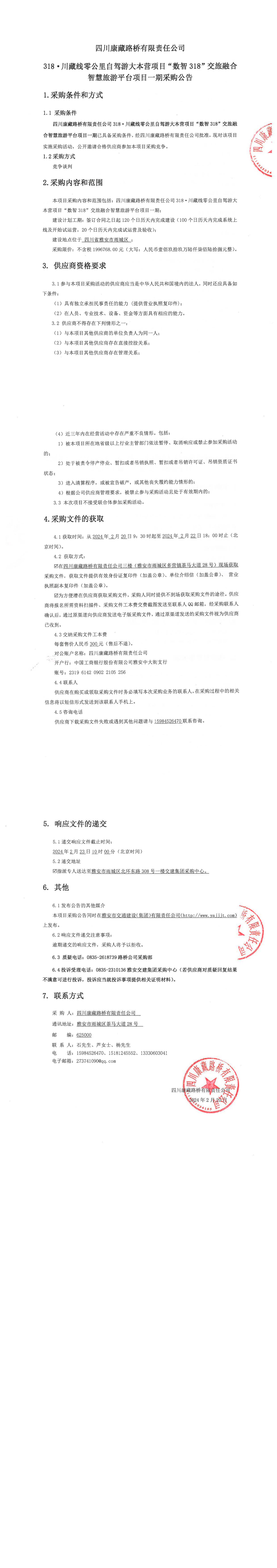 四川康藏路橋有限責(zé)任公司318·川藏線零公里自駕游大本營(yíng)項(xiàng)目“數(shù)智318”交旅融合智慧旅游平臺(tái)項(xiàng)目一期采購(gòu)公告