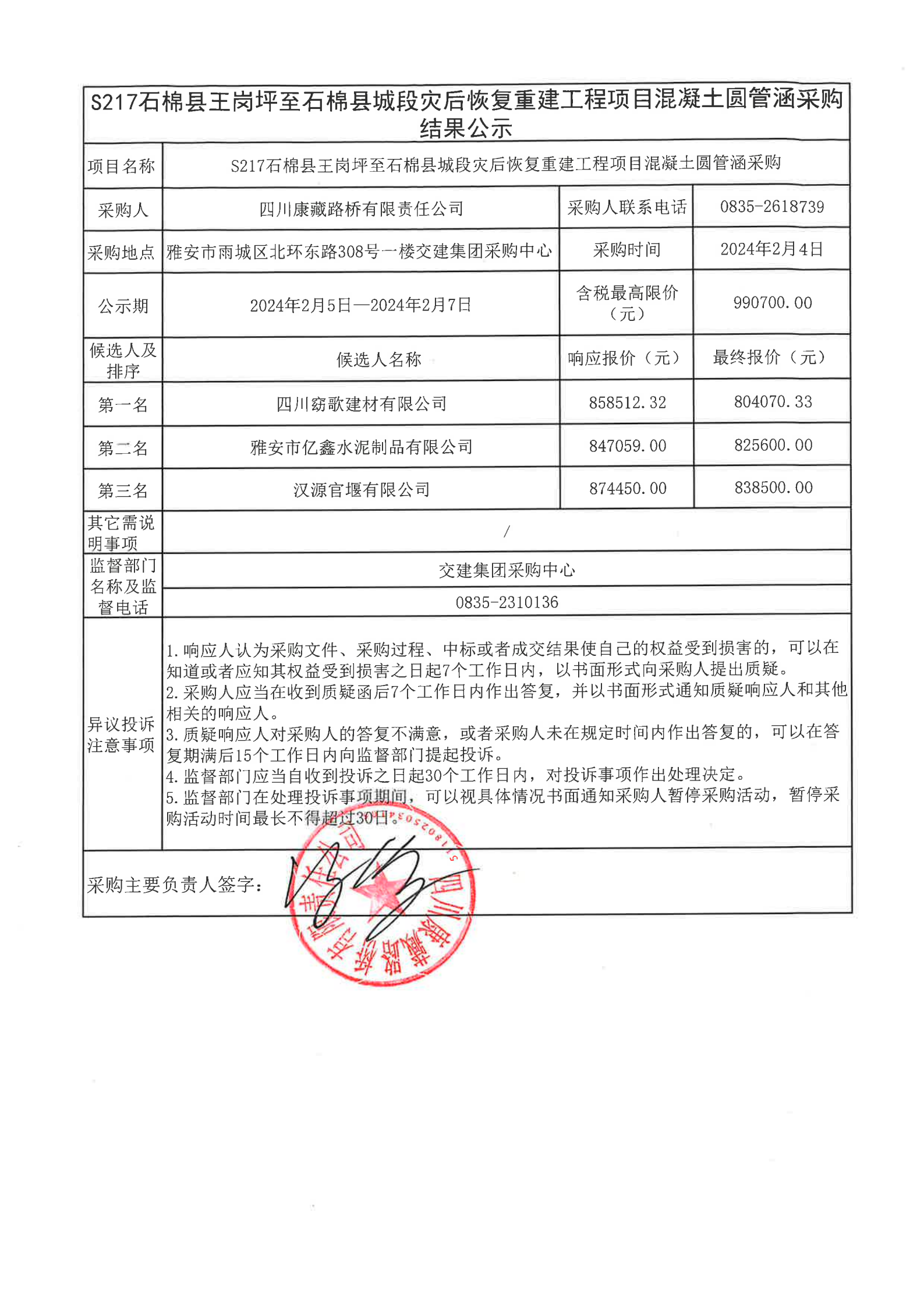 四川康藏路橋有限責任公司S217石棉縣王崗坪至石棉縣城段災后恢復重建工程項目混凝土圓管涵采購結果公示