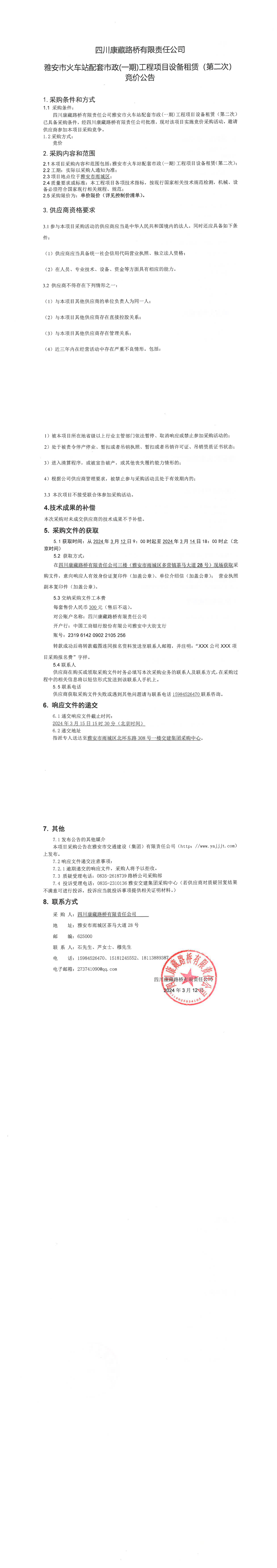 四川康藏路橋有限責(zé)任公司雅安市火車(chē)站配套市政(一期)工程項(xiàng)目設(shè)備租賃(第二次)競(jìng)價(jià)公告