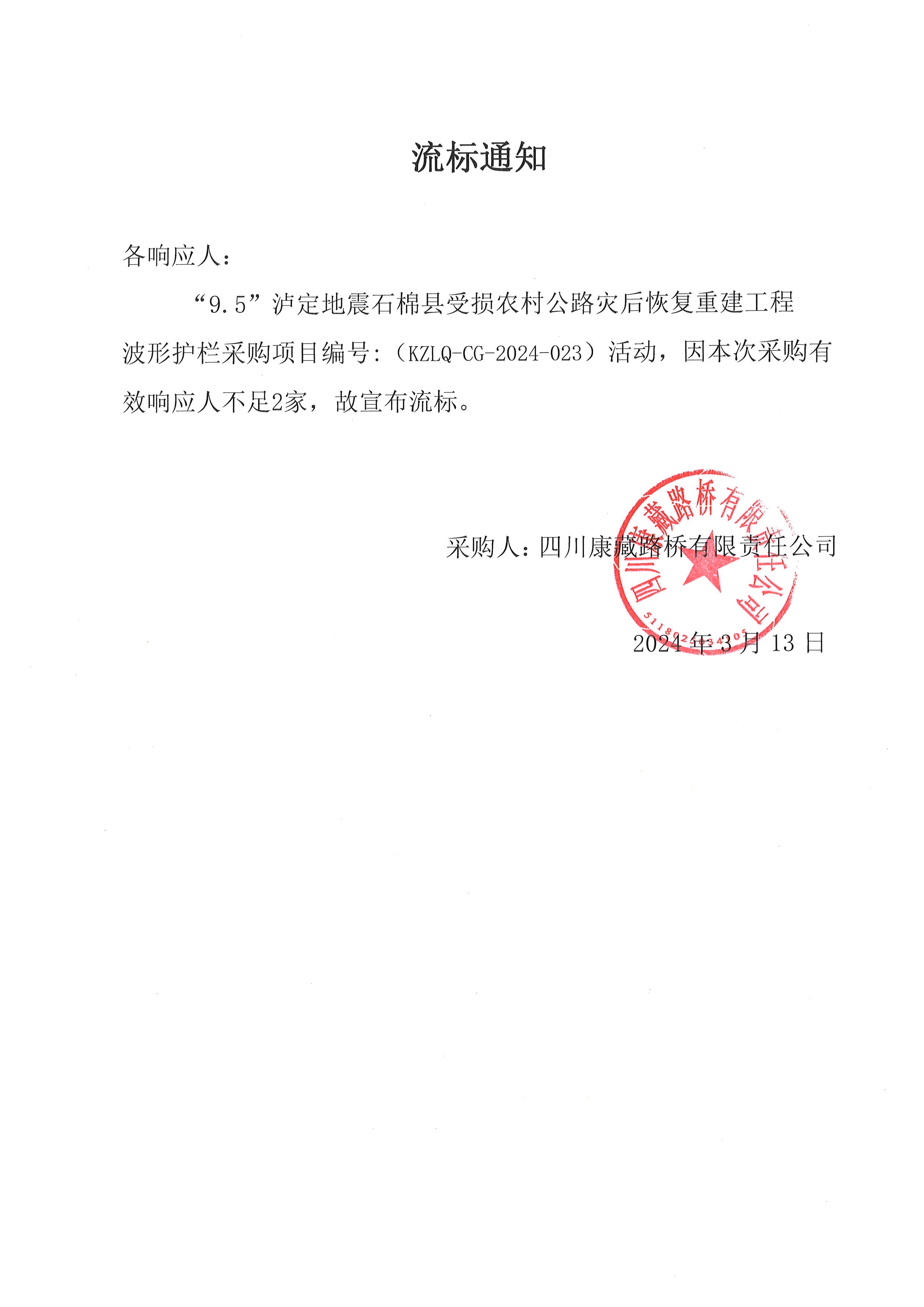 四川康藏路橋有限責任公司“9.5”瀘定地震石棉縣受損農(nóng)村公路災后恢復重建工程波形護欄采購流標通知