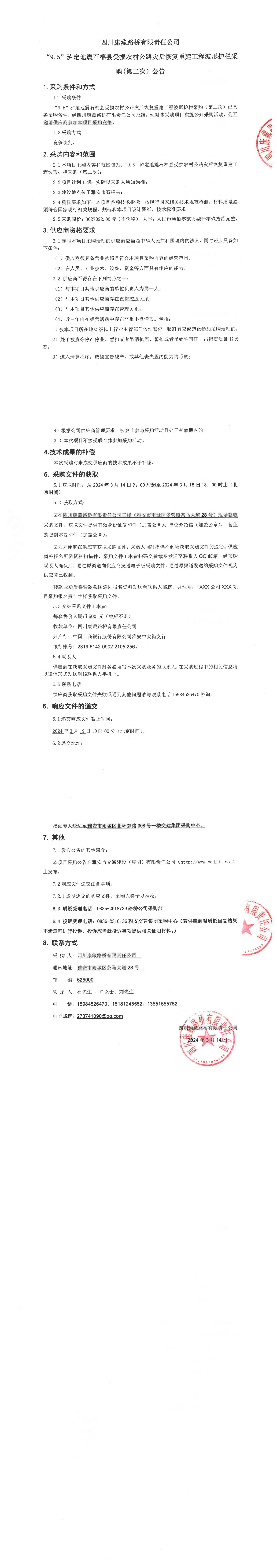 四川康藏路橋有限責(zé)任公司“9.5”瀘定地震石棉縣受損農(nóng)村公路災(zāi)后恢復(fù)重建工程波形護欄采購(第二次)公告