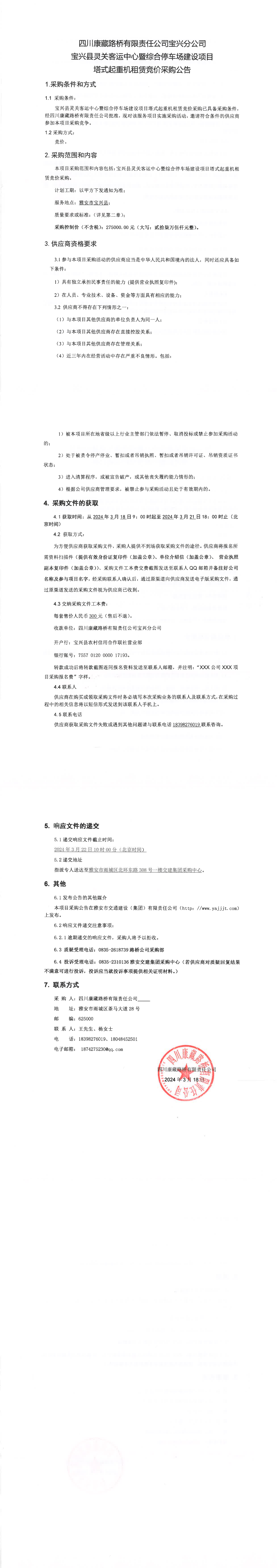 四川康藏路橋有限責(zé)任公司寶興縣靈關(guān)客運中心暨綜合停車場建設(shè)項目塔式起重機租賃競價采購公告