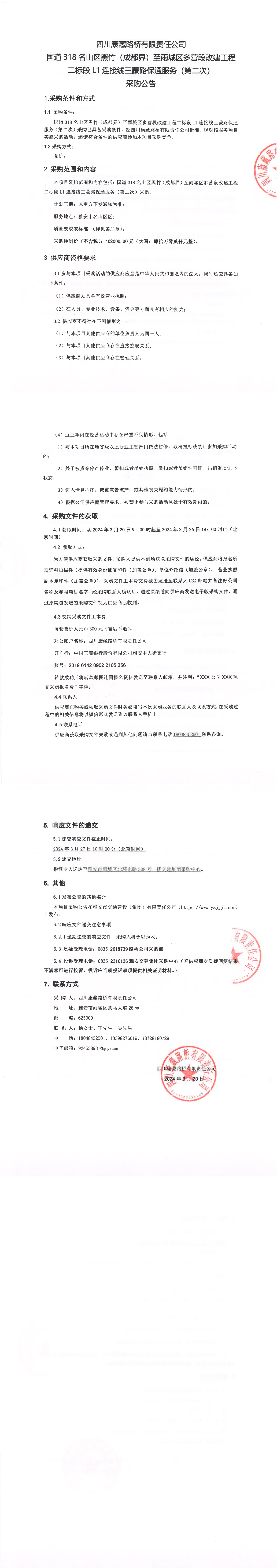四川康藏路橋有限責(zé)任公司國(guó)道318名山區(qū)黑竹(成都界)至雨城區(qū)多營(yíng)段改建工程二標(biāo)段L1連接線三蒙路保通服務(wù)(第二次)采購(gòu)公告