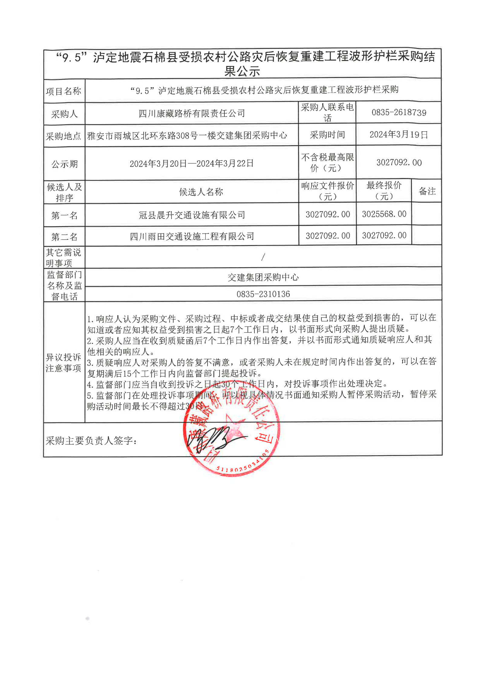 四川康藏路橋有限責(zé)任公司“9.5”瀘定地震石棉縣受損農(nóng)村公路災(zāi)后恢復(fù)重建工程波形護(hù)欄采購結(jié)果公示