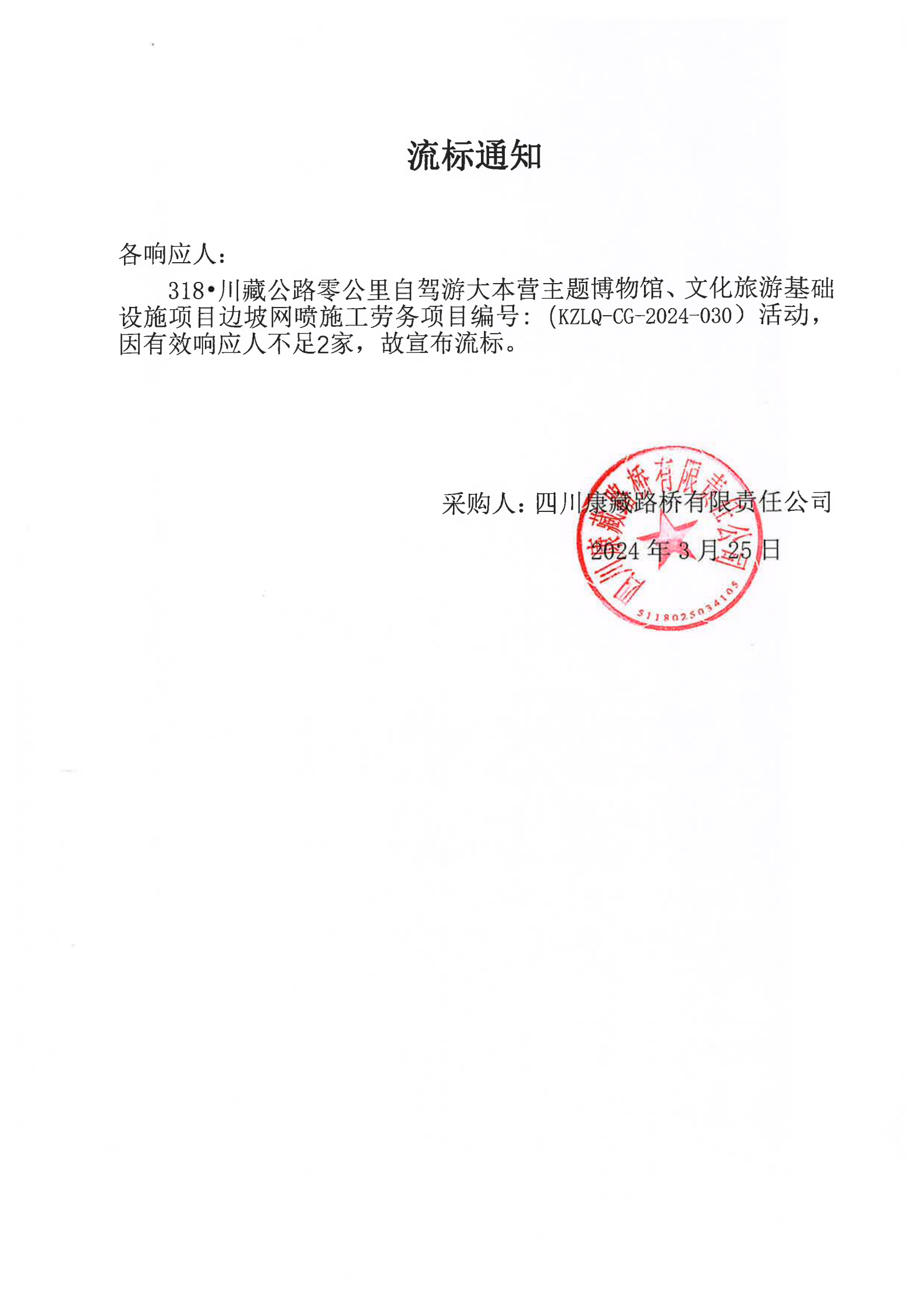 四川康藏路橋有限責(zé)任公司318·川藏公路零公里自駕游大本營(yíng)主題博物館、文化旅游基礎(chǔ)設(shè)施項(xiàng)目邊坡網(wǎng)噴施工勞務(wù)流標(biāo)通知