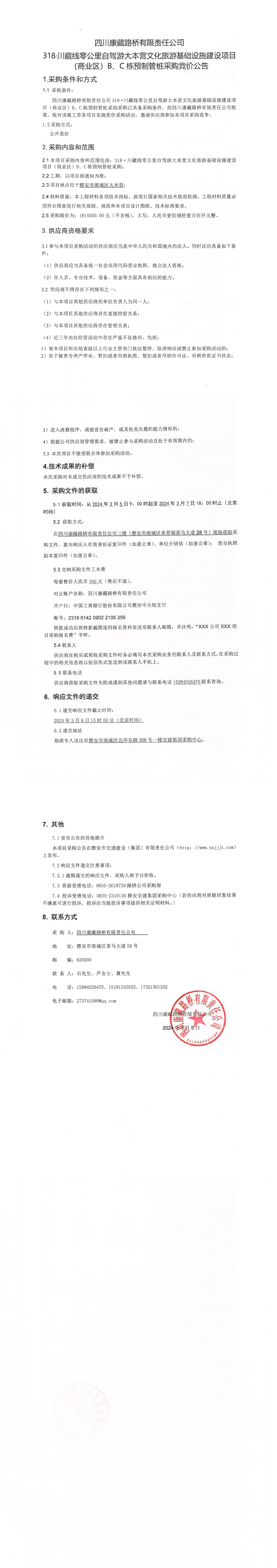 四川康藏路橋有限責任公司318·川藏公路零公里自駕游大本營文化旅游基礎設施建設項目(商業(yè)區(qū))B\C棟預制管樁采購競價公告