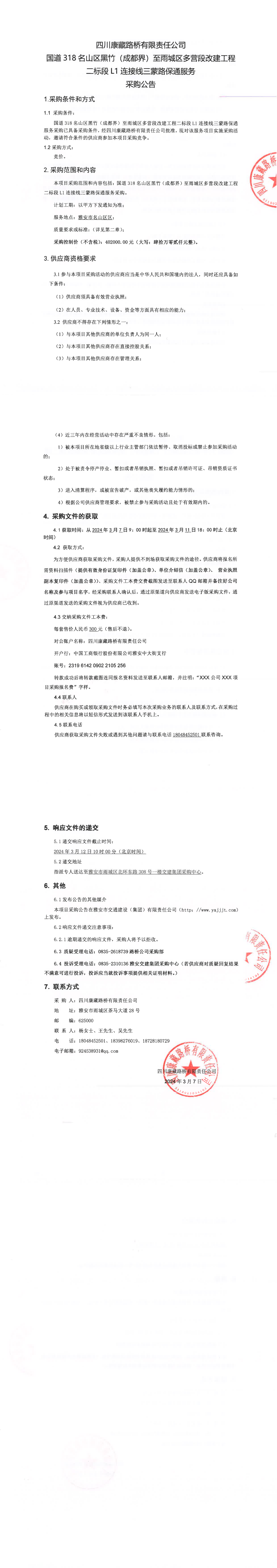 四川康藏路橋有限責(zé)任公司國(guó)道318名山區(qū)黑竹(成都界)至雨城區(qū)多營(yíng)段改建工程二標(biāo)段L1連接線三蒙路保通服務(wù)采購(gòu)公告