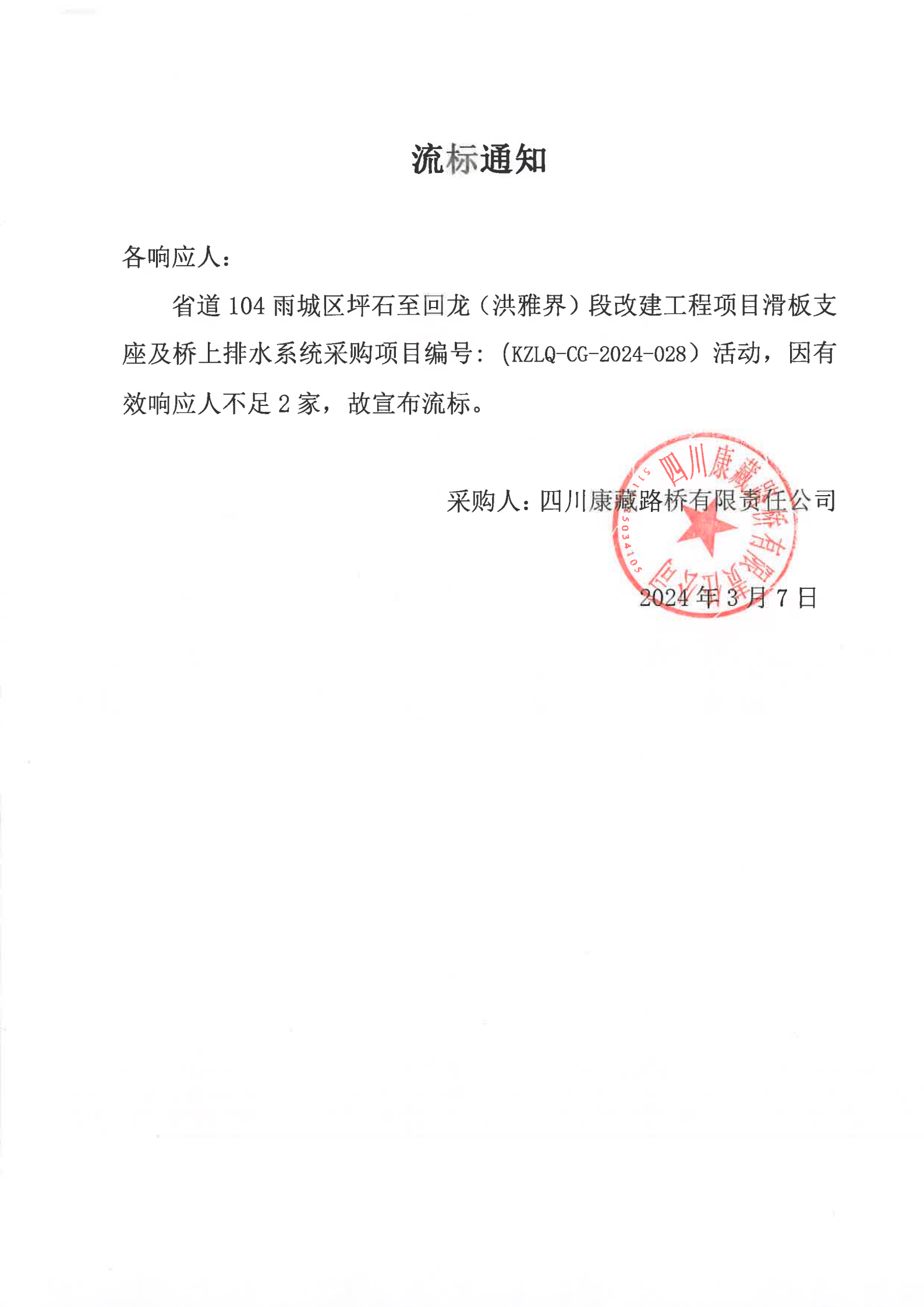 四川康藏路橋有限責(zé)任公司省道104雨城區(qū)坪石至回龍(洪雅界)段改建工程項(xiàng)目滑板支座及橋上排水系統(tǒng)流采購(gòu)標(biāo)通知