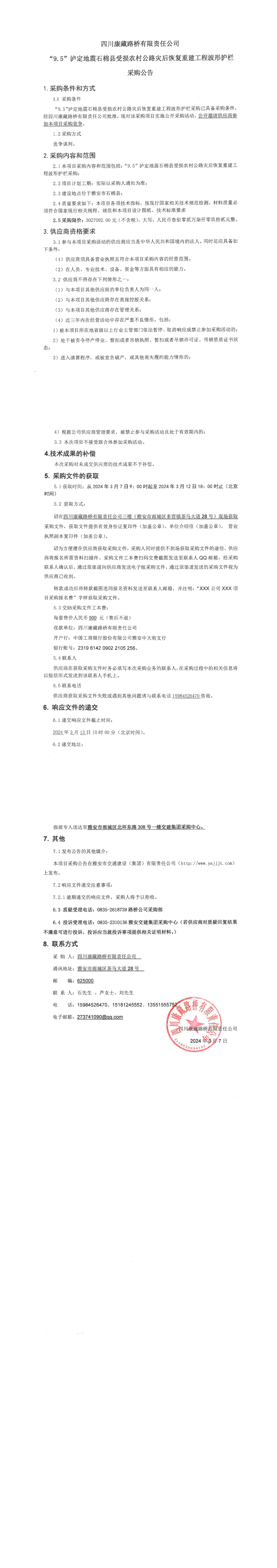 四川康藏路橋有限責任公司“9.5”瀘定地震石棉縣受損農(nóng)村公路災后恢復重建工程波形護欄采購公告