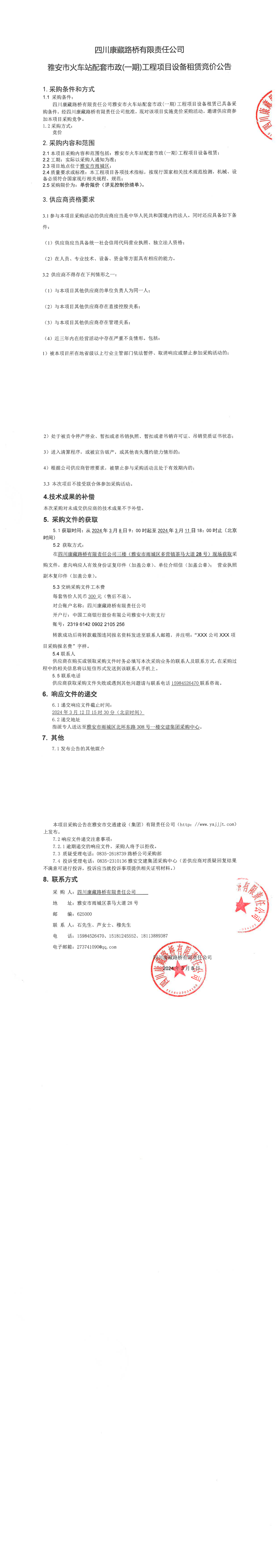四川康藏路橋有限責(zé)任公司雅安市火車站配套市政(一期)工程項(xiàng)目設(shè)備租賃競(jìng)價(jià)公告