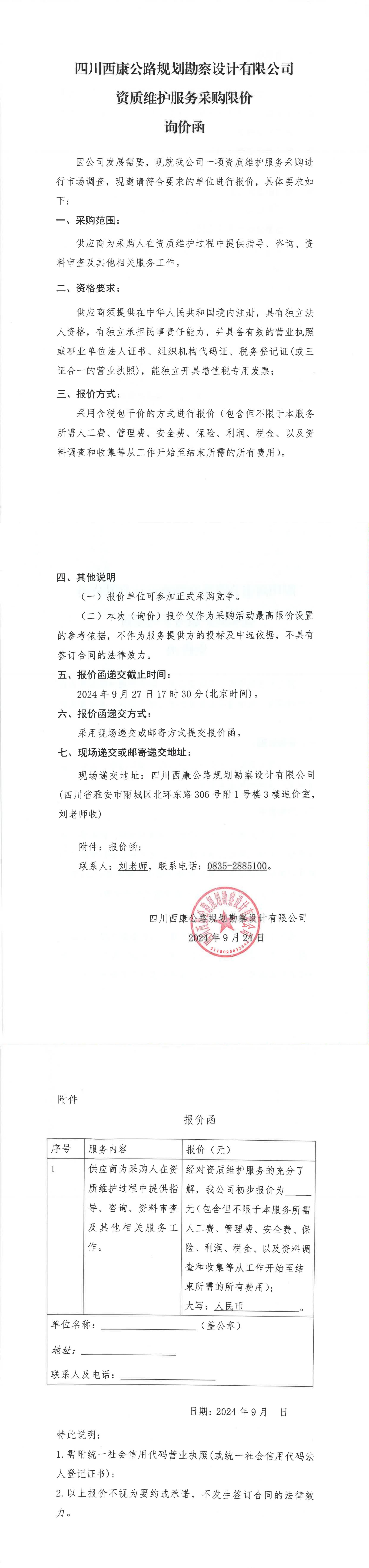 四川西康公路規(guī)劃勘察設計有限公司資質維護服務采購限價詢價函