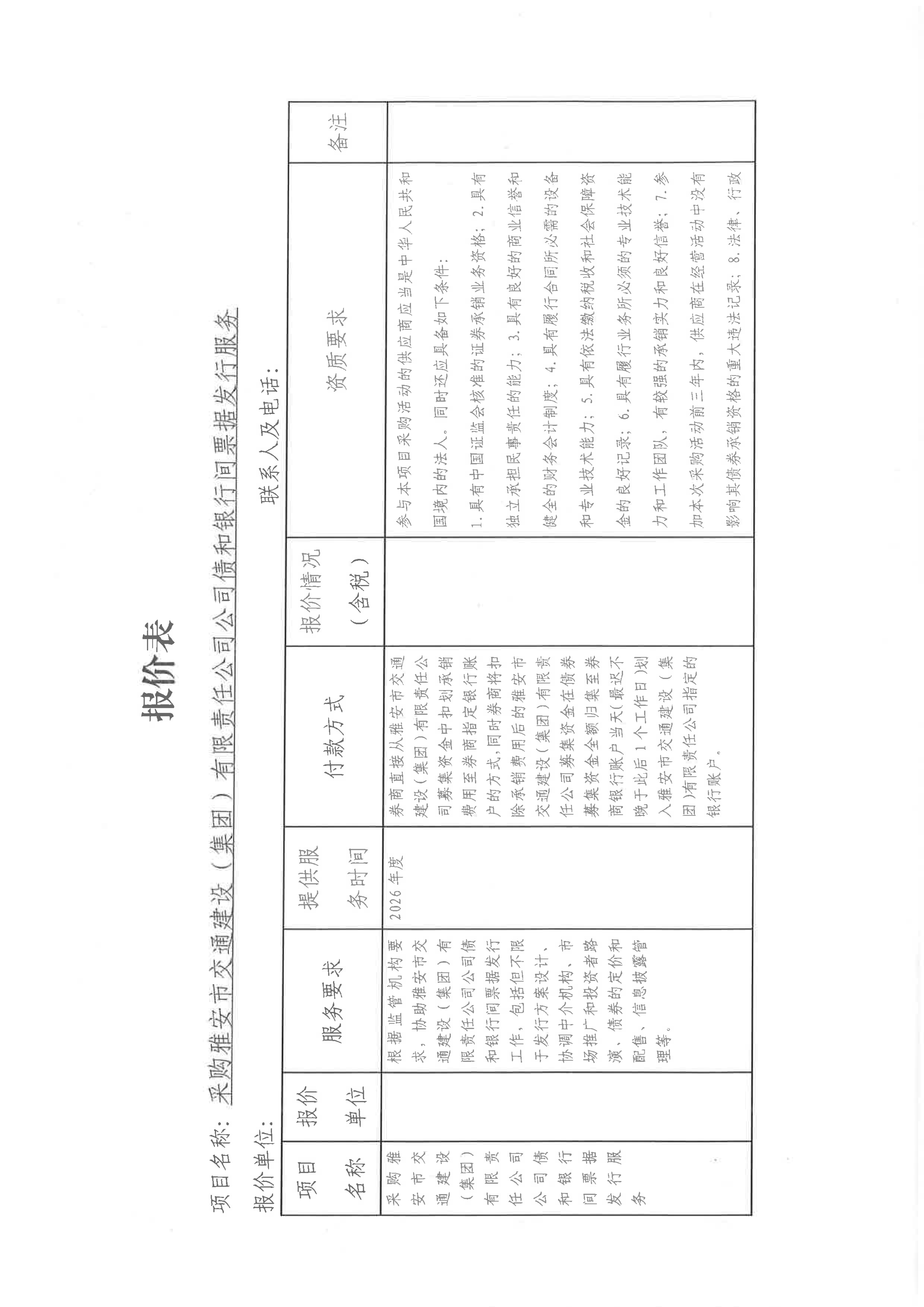 關于采購雅安市交通建設(集團)有限責任公司發(fā)行公司債和發(fā)行銀行間票據(jù)所需券商服務限價的詢價函