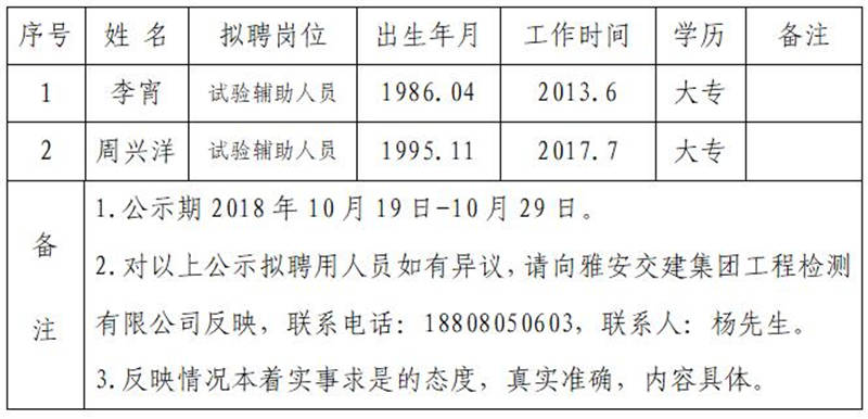 雅安交建集團工程檢測有限公司擬聘用人員公示