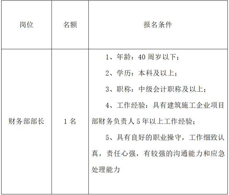 雅安交建集團(tuán)路橋有限責(zé)任公司是雅安市交通建設(shè)(集團(tuán))有限責(zé)任公司下屬子公司,主要從事道路、橋梁修建,F(xiàn)根據(jù)公司業(yè)務(wù)發(fā)展需要,擬向社會(huì)公開招聘1名財(cái)務(wù)部部長,現(xiàn)將有關(guān)事項(xiàng)公告如下: