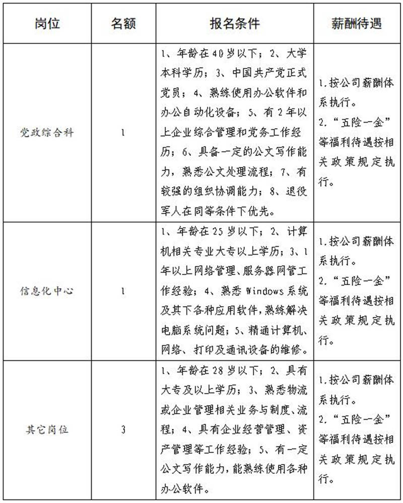 雅安交建集團(tuán)無水港物流有限責(zé)任公司主要從事雅安市快遞物流分撥、集裝箱掏拼箱作業(yè)、倉儲等業(yè)務(wù),F(xiàn)根據(jù)公司業(yè)務(wù)發(fā)展需要,雨城分公司擬招聘5名工作人員,現(xiàn)將有關(guān)事項(xiàng)公告如下: