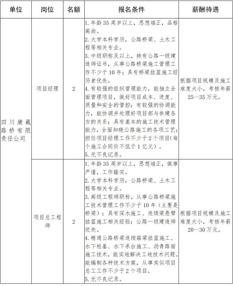根據(jù)發(fā)展需要,決定面向社會公開招聘雅安市交通建設(shè)(集團)有限責(zé)任公司(以下簡稱“雅安交建集團”)所屬子公司工程項目主要負責(zé)人10名,現(xiàn)將有關(guān)事項公告如下: