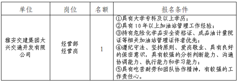 根據(jù)發(fā)展需要,決定面向社會(huì)公開招聘雅安市交通建設(shè)(集團(tuán))有限責(zé)任公司(以下簡稱“雅安交建集團(tuán)”)所屬子公司工作人員1名,現(xiàn)將有關(guān)事項(xiàng)公告如下: