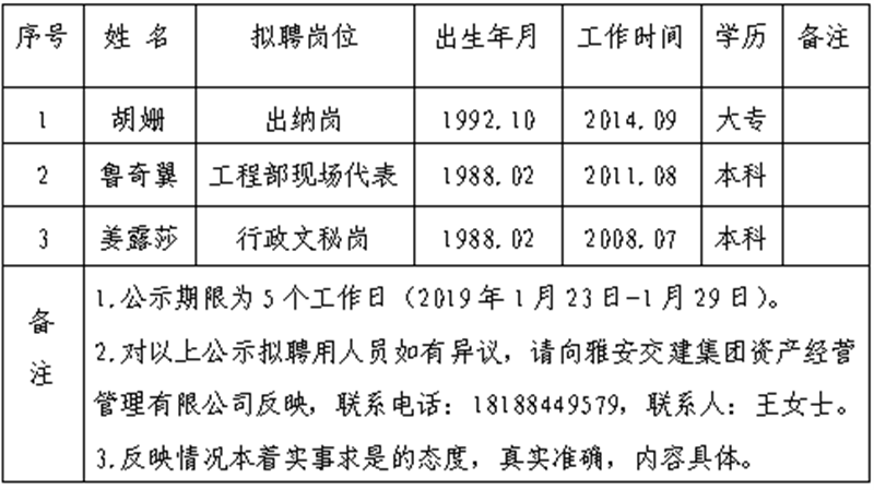 通過公開報(bào)名、資格審查、筆試、面試等程序,經(jīng)雅安交建集團(tuán)資產(chǎn)經(jīng)營管理有限公司研究,對以下3名擬聘用人員予以公示: