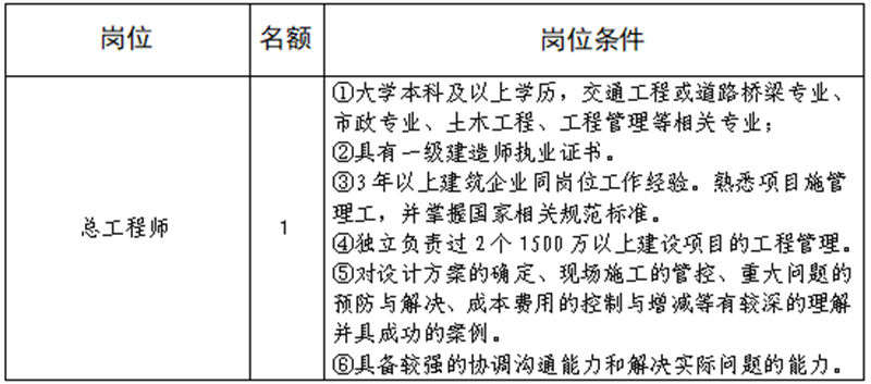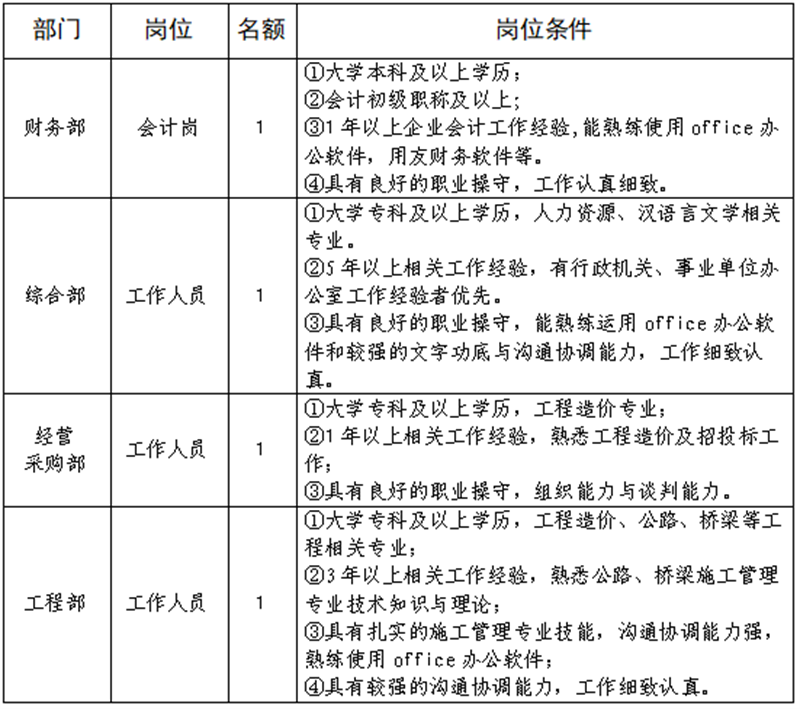 雅安交建集團(tuán)路橋有限責(zé)任公司是雅安市交通建設(shè)(集團(tuán))有限責(zé)任公司下屬子公司,主要從事道路、橋梁修建,F(xiàn)根據(jù)公司業(yè)務(wù)發(fā)展需要,擬向社會公開招聘總工程師1名,工作人員4名,現(xiàn)將有關(guān)事項公告如下: