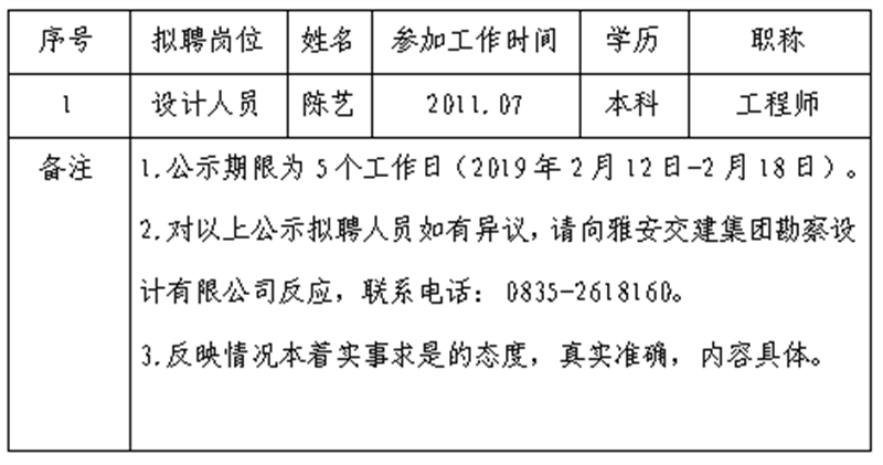 通過公開報名、資格審查、面試等程序,經(jīng)雅安交建集團勘察設(shè)計有限公司研究,對以下1名擬聘用人員予以公示: