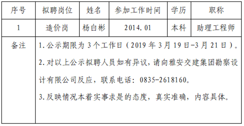 雅安交建集團(tuán)勘察設(shè)計有限公司擬聘用人員公示