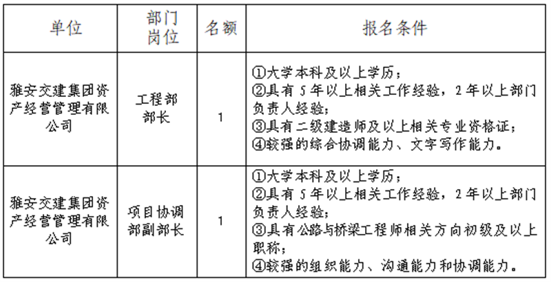 根據(jù)發(fā)展需要,決定面向社會公開招聘雅安市交通建設(shè)(集團)有限責任公司(以下簡稱“雅安交建集團”)所屬子公司工作人員2名,現(xiàn)將有關(guān)事項公告如下: