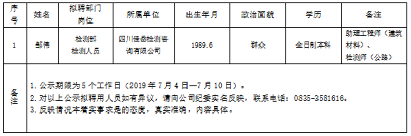 雅安交建集團子公司擬聘用人員公示(佳岳公司)