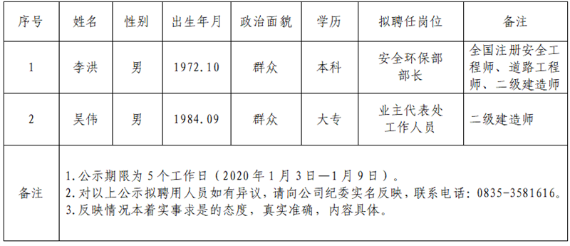 雅安交建集團(tuán)項(xiàng)目管理有限公司擬聘用人員公示
