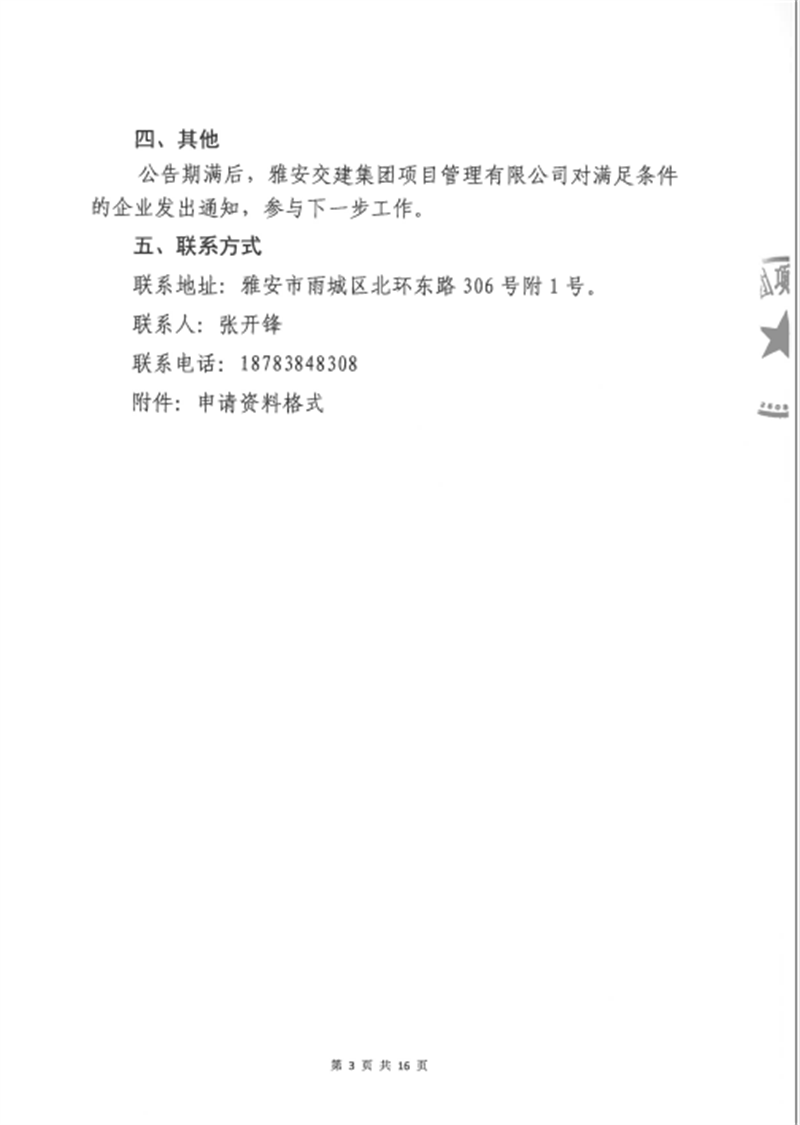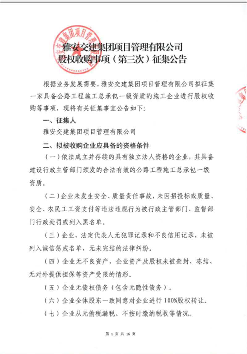 雅安交建集團(tuán)項(xiàng)目管理有限公司股權(quán)收購(gòu)事項(xiàng)(第三次)征集公告