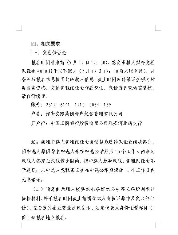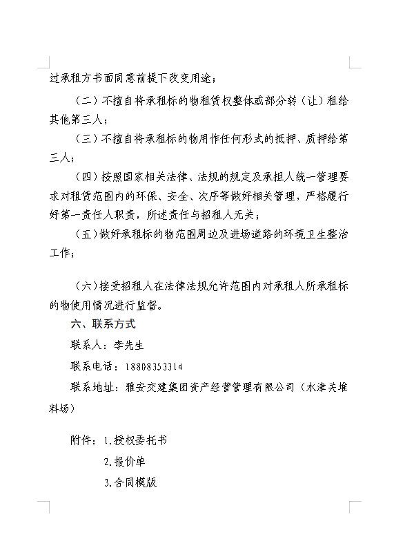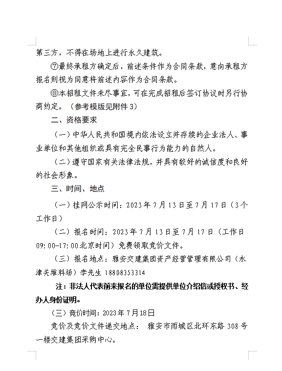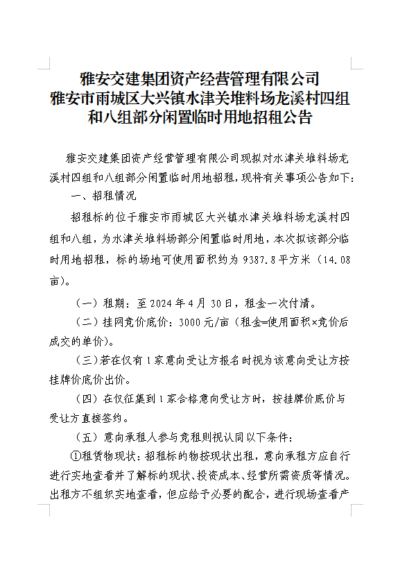 雅安交建集團(tuán)資產(chǎn)經(jīng)營(yíng)管理有限公司雨城區(qū)大興鎮(zhèn)水津關(guān)堆料場(chǎng)龍溪村四組和八組部分閑置臨時(shí)用地招租公告
