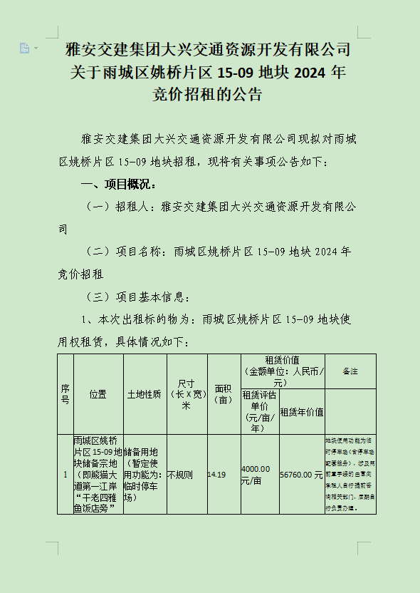 雅安交建集團(tuán)大興交通資源開發(fā)有限公司關(guān)于雨城區(qū)姚橋片區(qū)15-09地塊2024年競(jìng)價(jià)招租的公告