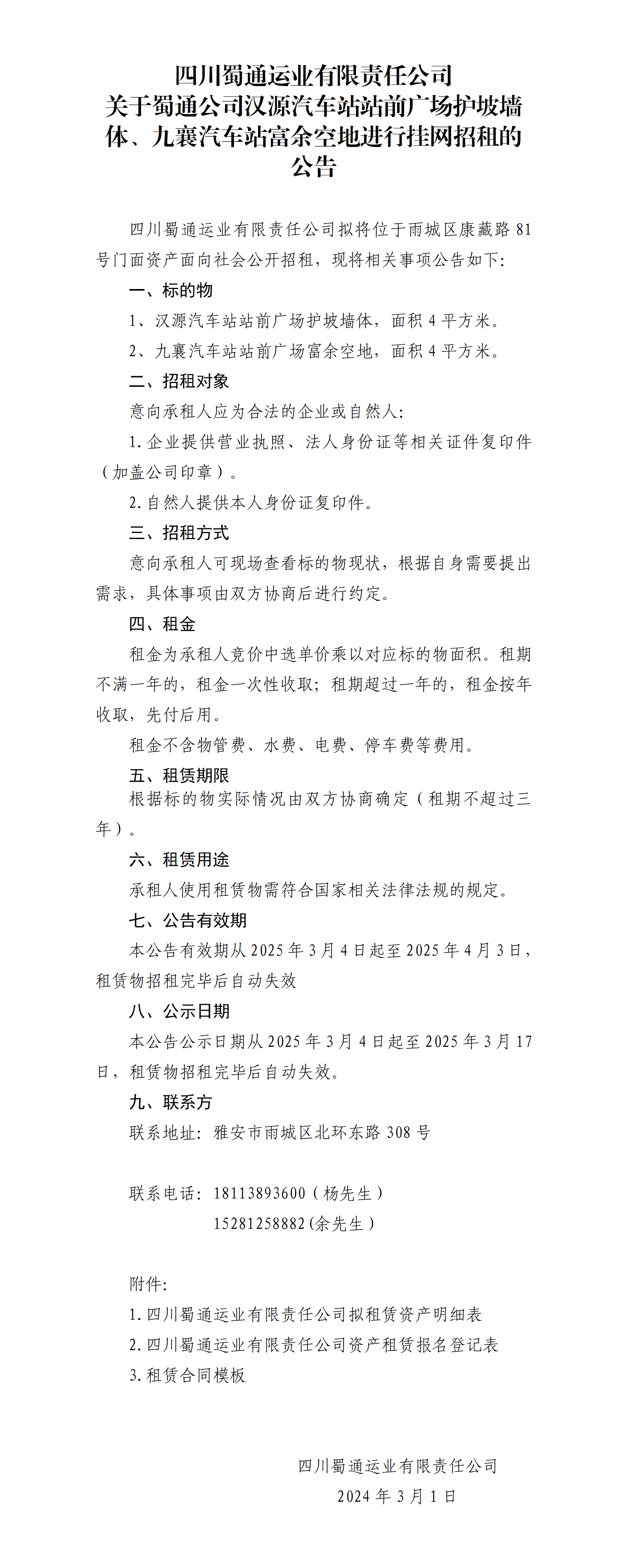 四川蜀通運(yùn)業(yè)有限責(zé)任公司 關(guān)于蜀通公司漢源汽車站站前廣場護(hù)坡墻體、九襄汽車站富余空地進(jìn)行掛網(wǎng)招租的公告