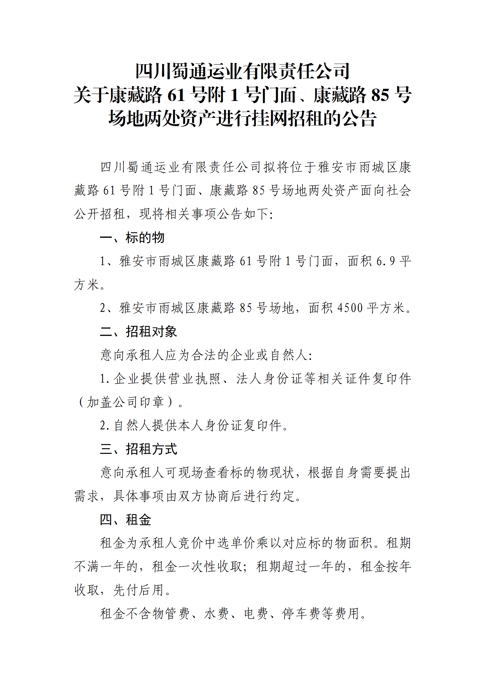 ËÄ´¨Êñͨß\(y¨´n)˜I(y¨¨)ÓÐÏÞØŸ(z¨¦)Èι«Ë¾ êP(gu¨¡n)ÓÚ¿µ²ØÂ·61Ì–(h¨¤o)¸½1Ì–(h¨¤o)éTÃæ¡¢¿µ²ØÂ·85Ì–(h¨¤o)ˆöµØƒÉÌŽÙY®a(ch¨£n)ßM(j¨¬n)ÐÐ’ì¾W(w¨£ng)ÕÐ×âµÄ¹«¸æ