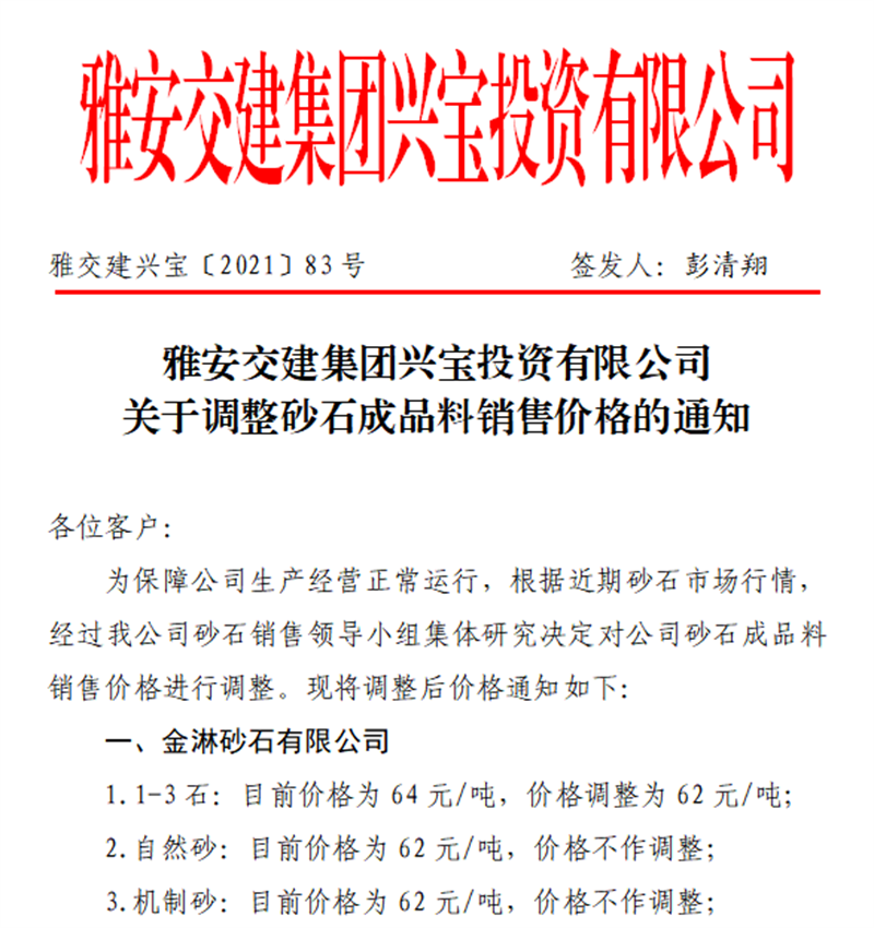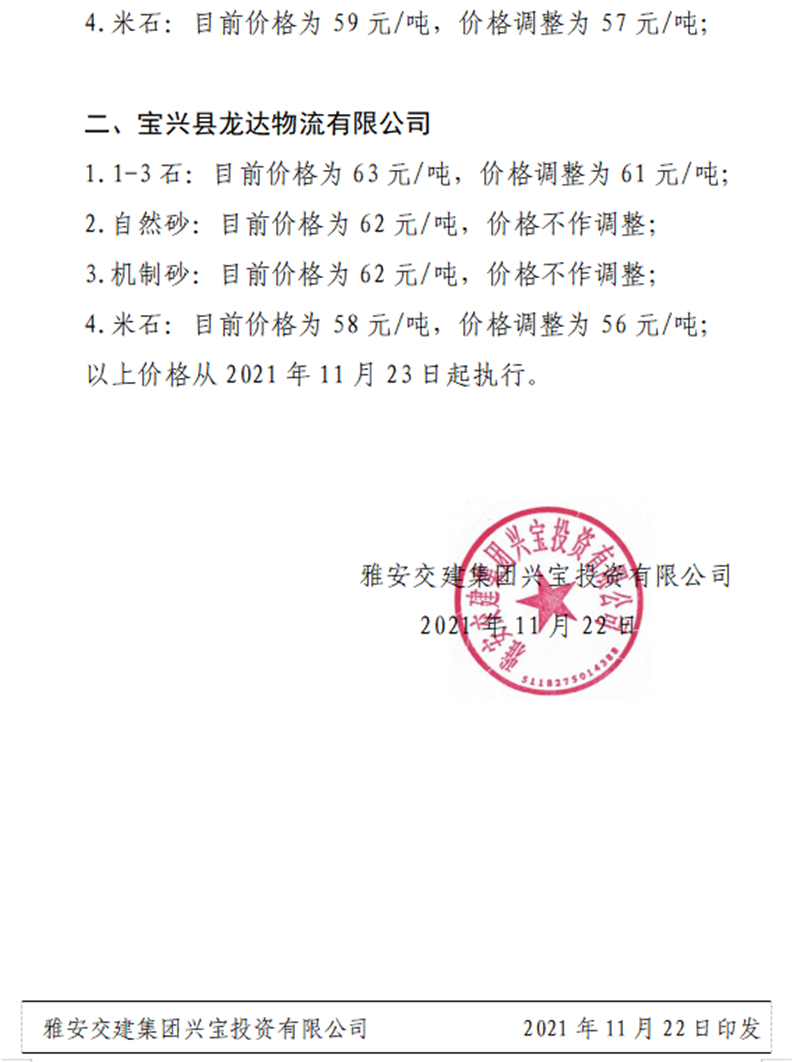 雅安交建集團(tuán)興寶公司關(guān)于調(diào)整成品料銷(xiāo)售價(jià)格的通知(2021.11.23)