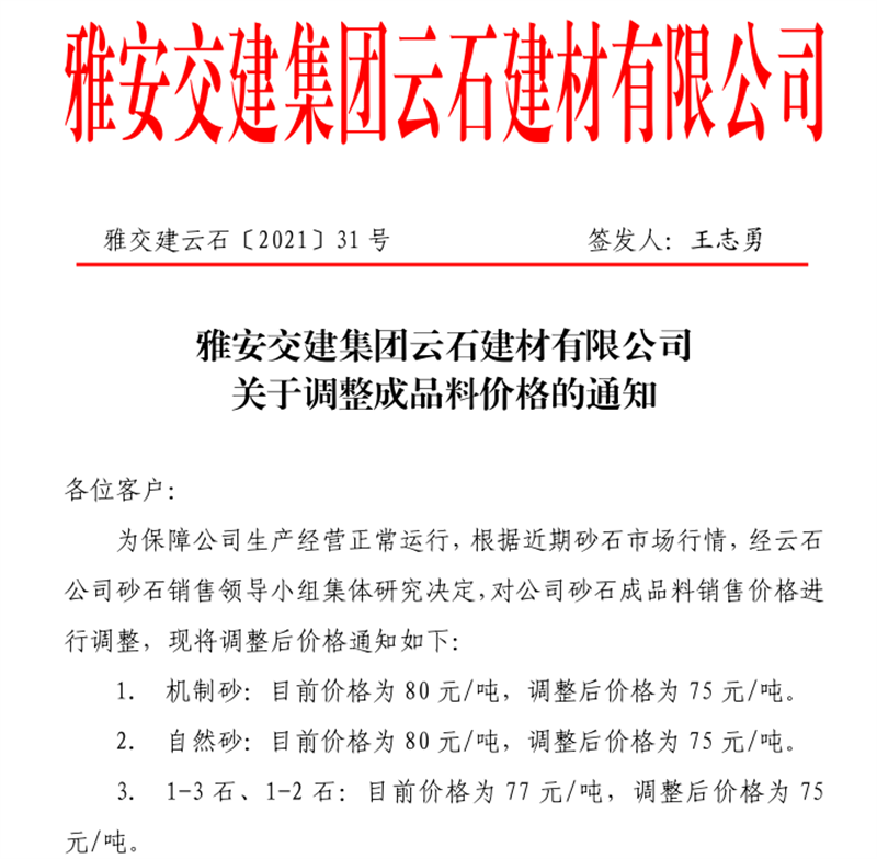 雅安交建集團(tuán)云石公司砂石骨料銷(xiāo)售價(jià)格情況表(2021.7.12)