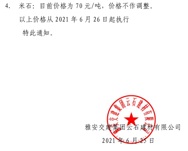 雅安交建集團(tuán)云石公司砂石骨料銷(xiāo)售價(jià)格情況表(2021.6.24)