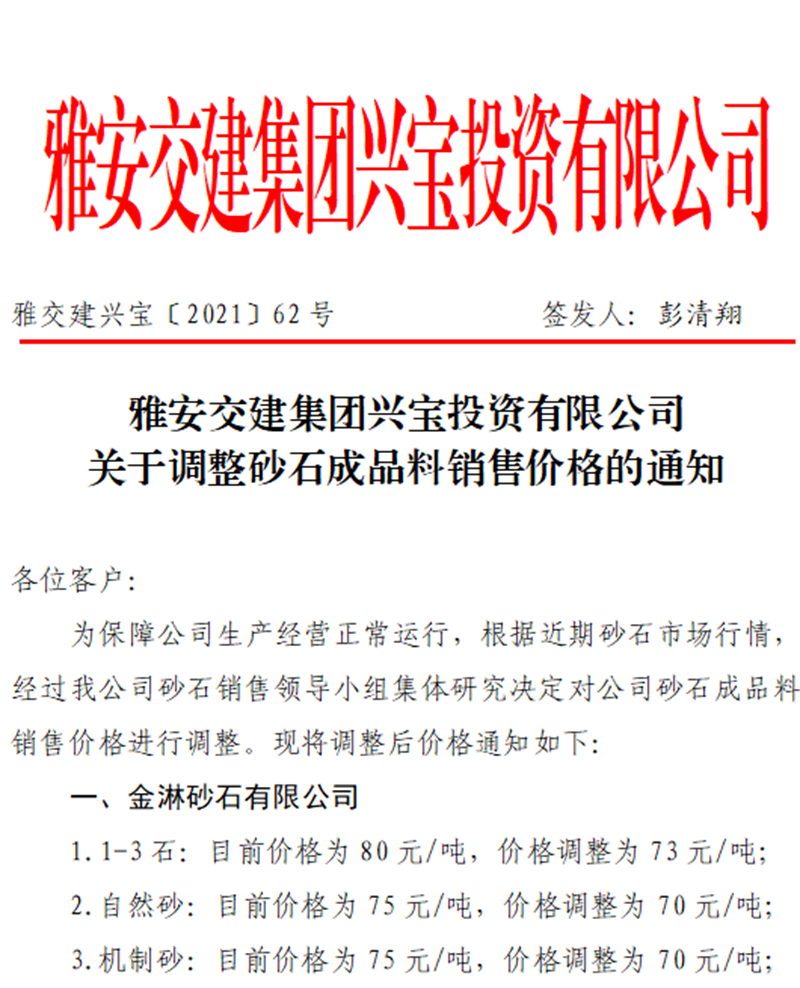 雅安交建集團(tuán)興寶公司關(guān)于調(diào)整砂石成品料銷(xiāo)售價(jià)格的通知(2021.9.28)