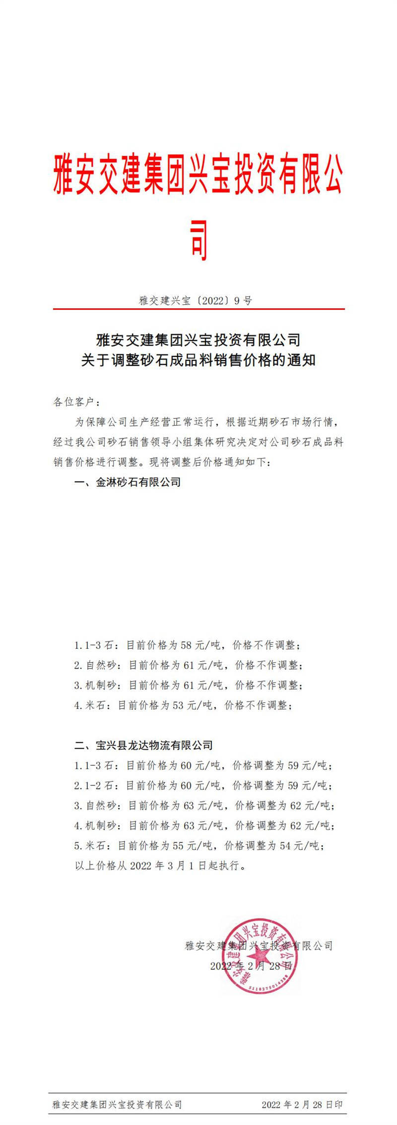 雅安交建集團(tuán)興寶投資有限公司 關(guān)于調(diào)整砂石成品料銷(xiāo)售價(jià)格的通知(2022-2-23)