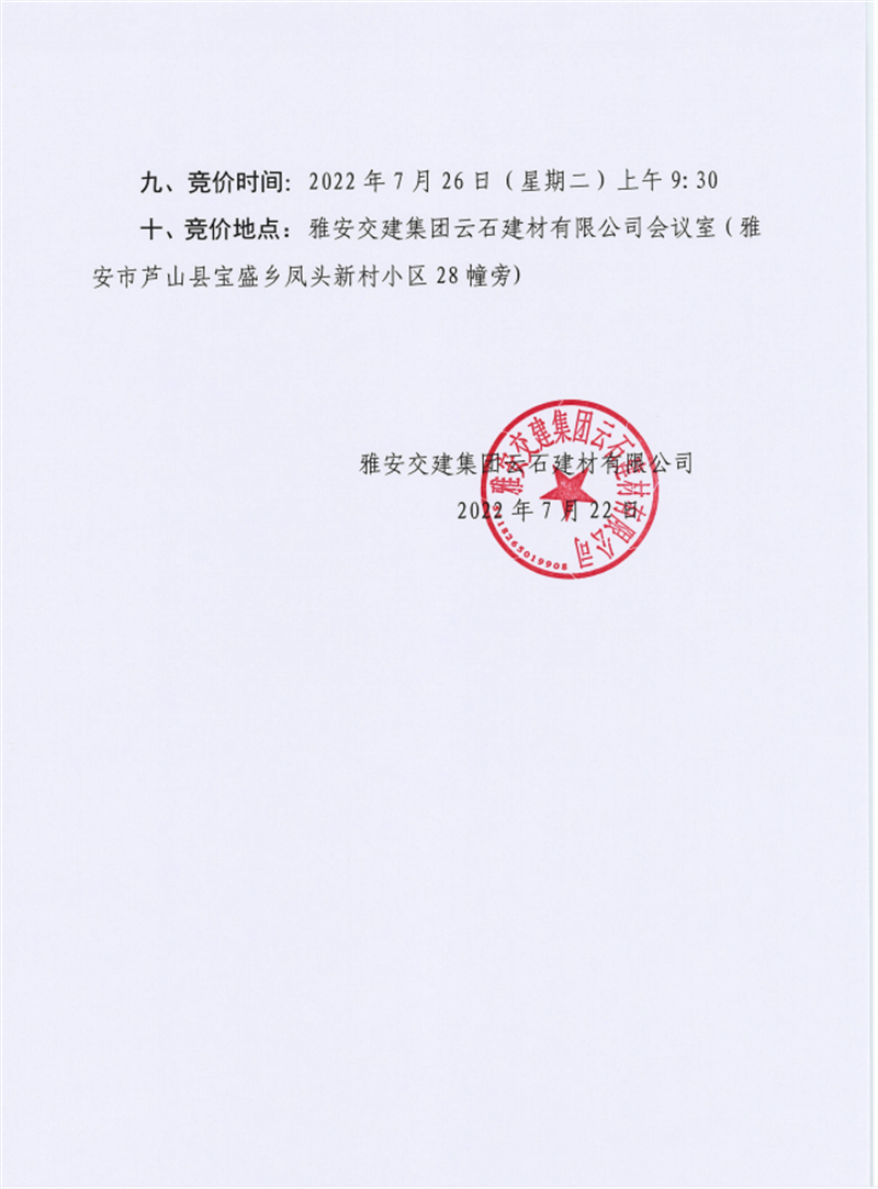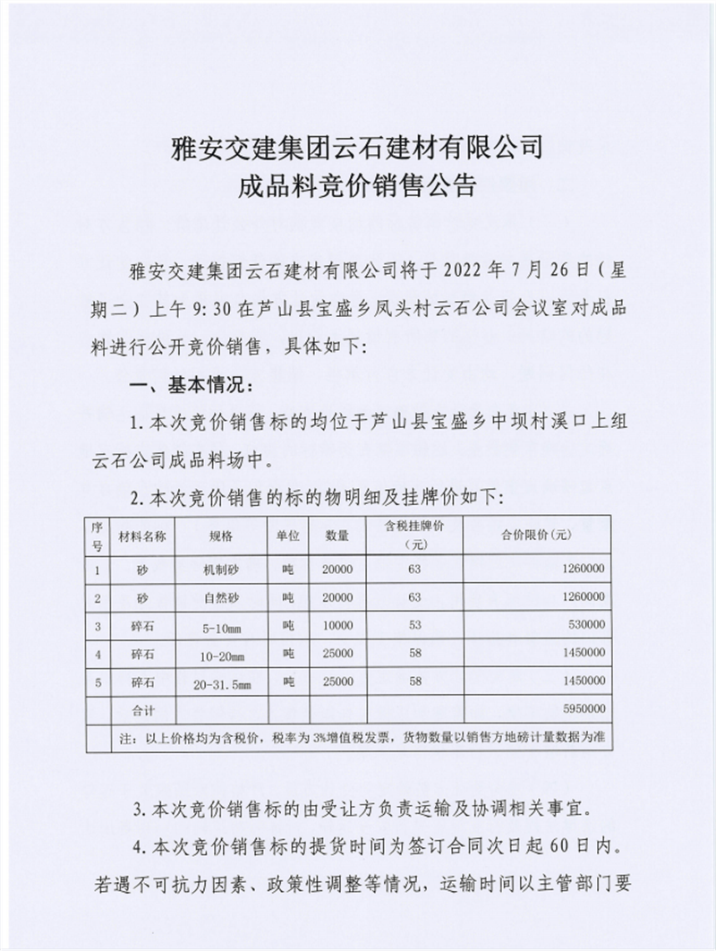 雅安交建集團(tuán)云石建材有限公司成品料競價銷售公告