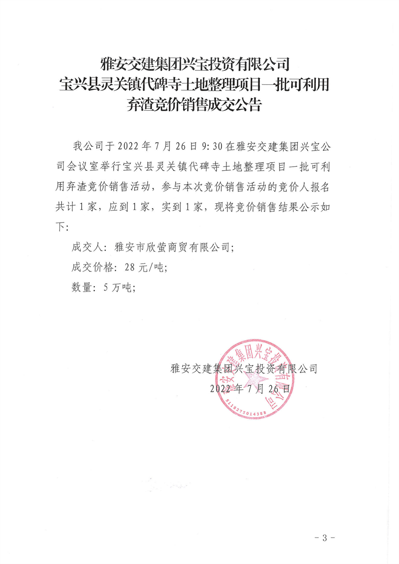 寶興縣靈關(guān)鎮(zhèn)代碑寺土地整理項(xiàng)目一批可利用棄渣競價銷售成交公告7.26(5萬噸)