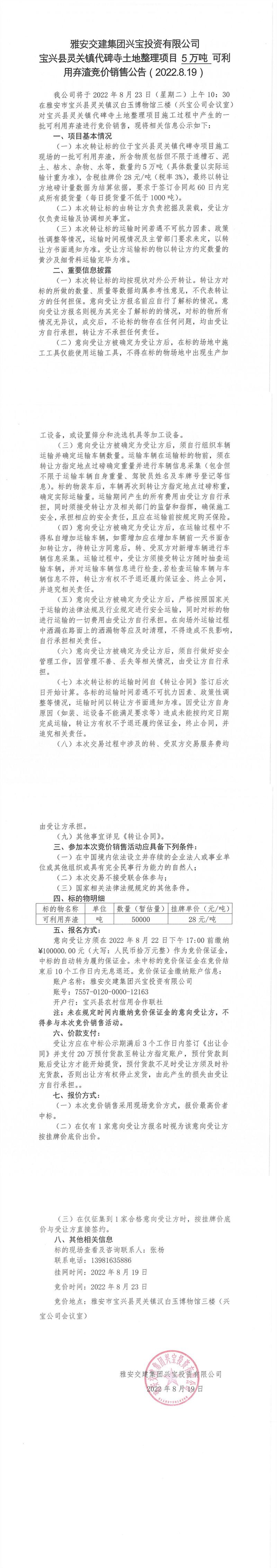 雅安交建集團興寶投資有限公司靈關鎮(zhèn)代碑寺土地整理項目10萬噸可利用棄渣競價銷售公告(2022.8.19)(1)