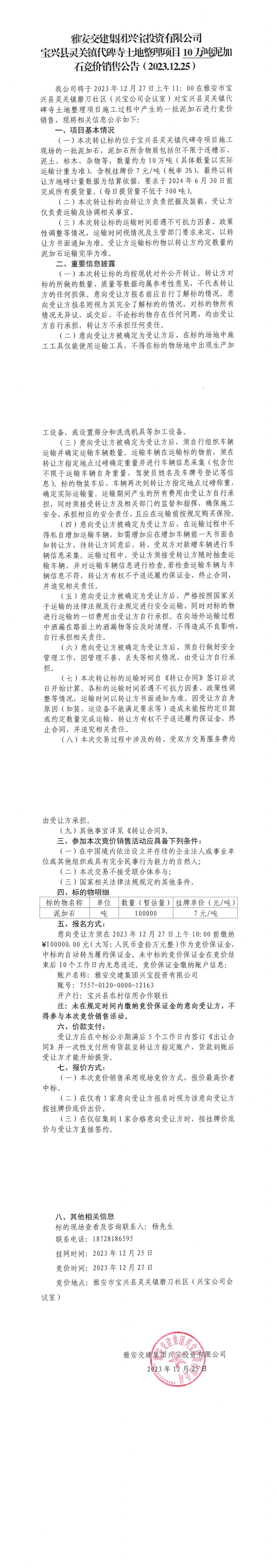 雅安交建集團(tuán)興寶投資有限公司10萬(wàn)噸泥加石競(jìng)價(jià)銷售公告(2023.12.25)