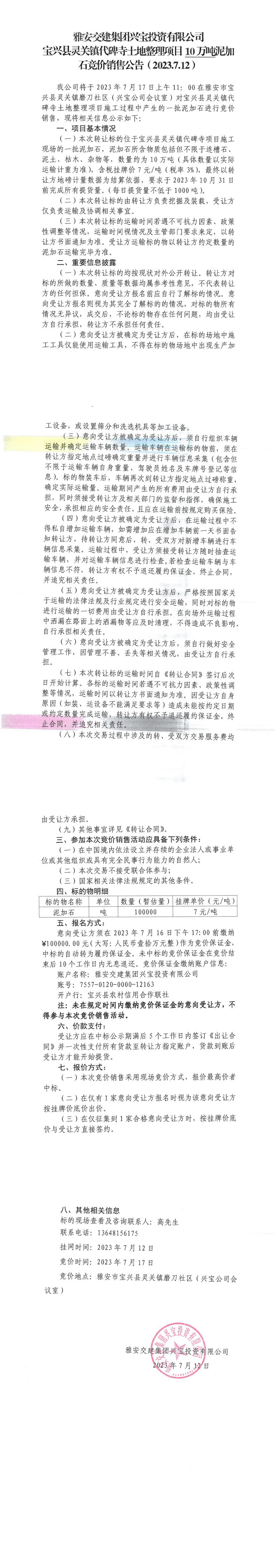雅安交建集團(tuán)興寶投資有限公司寶興縣靈關(guān)鎮(zhèn)代碑寺土地整理項目10萬噸泥加石競價銷售公告(2023.7.12)