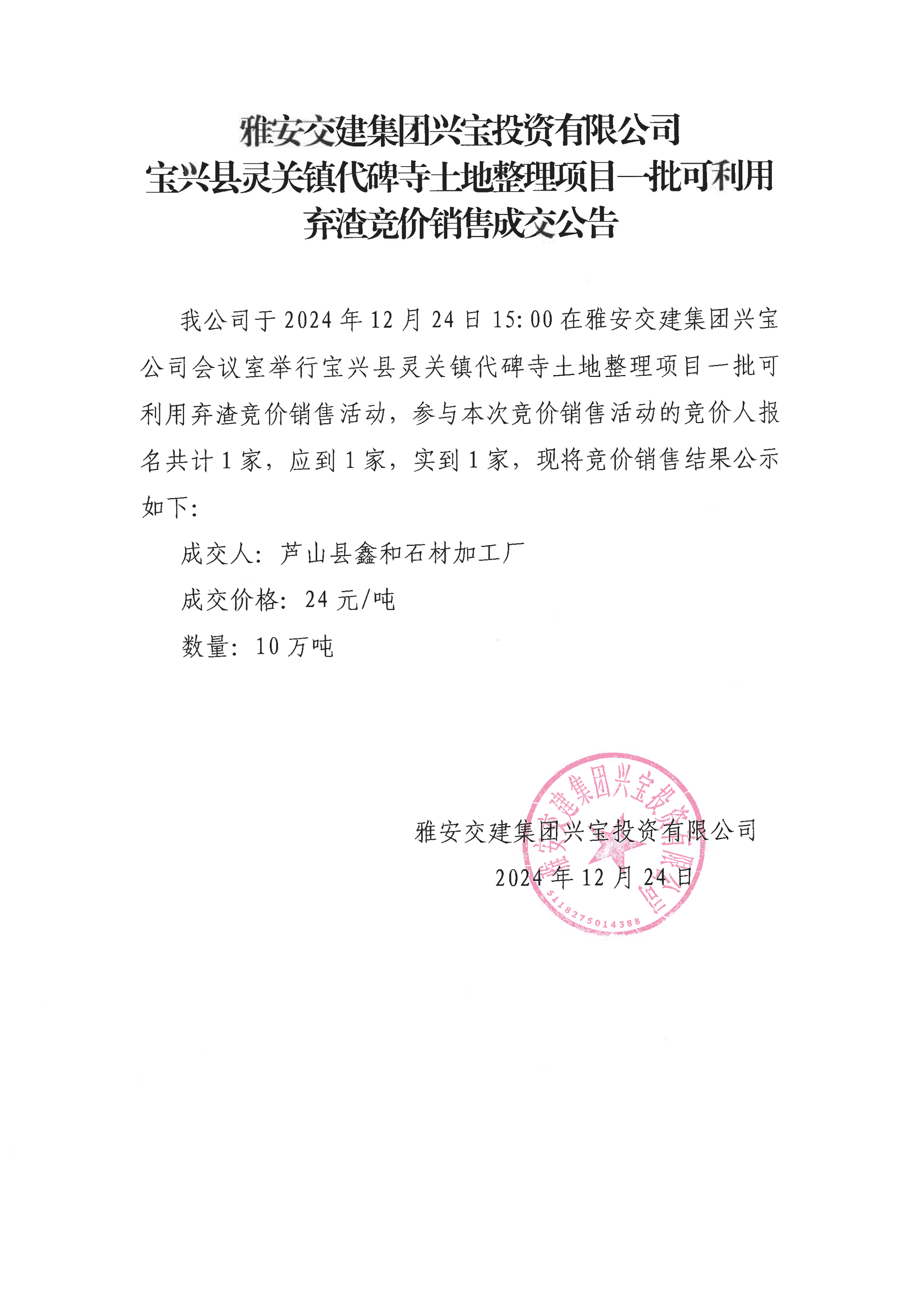 雅安交建集團(tuán)興寶投資有限公司靈關(guān)鎮(zhèn)代碑寺土地整理項目10萬噸可利用棄渣成交公告(2024.12.24)