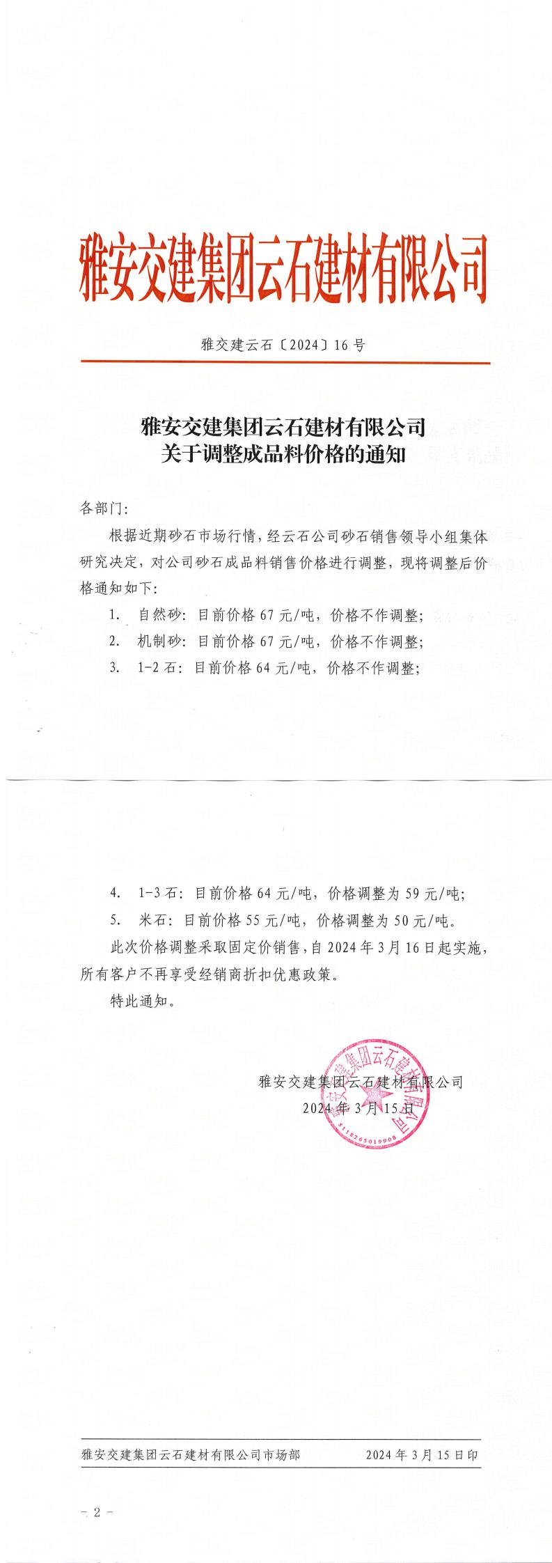 ÑŰ²½»½¨¼¯ˆFÔÆÊ¯½¨²ÄÓÐÏÞ¹«Ë¾³ÉÆ·Áσr¸ñÕ{(di¨¤o)Õû¹«¸æ£¨2024-2-21£©