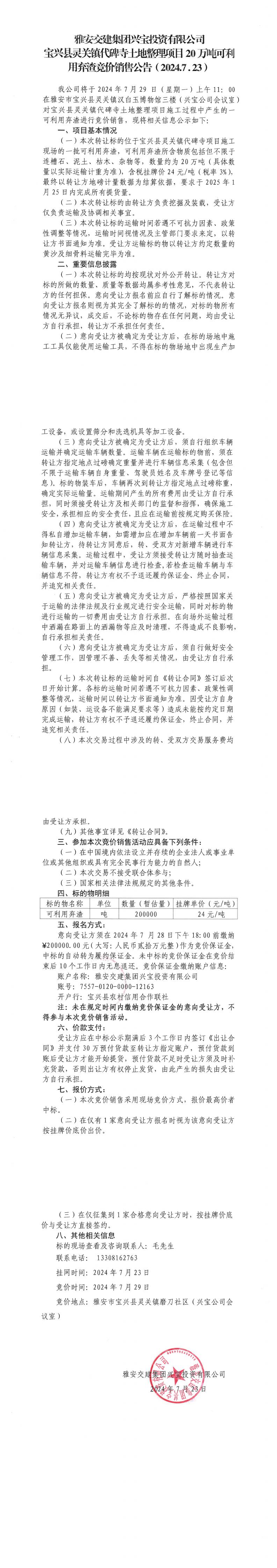 雅安交建集團(tuán)興寶投資有限公司靈關(guān)鎮(zhèn)代碑寺土地整理項(xiàng)目20萬噸可利用棄渣競(jìng)價(jià)銷售公告(2024.7.23)