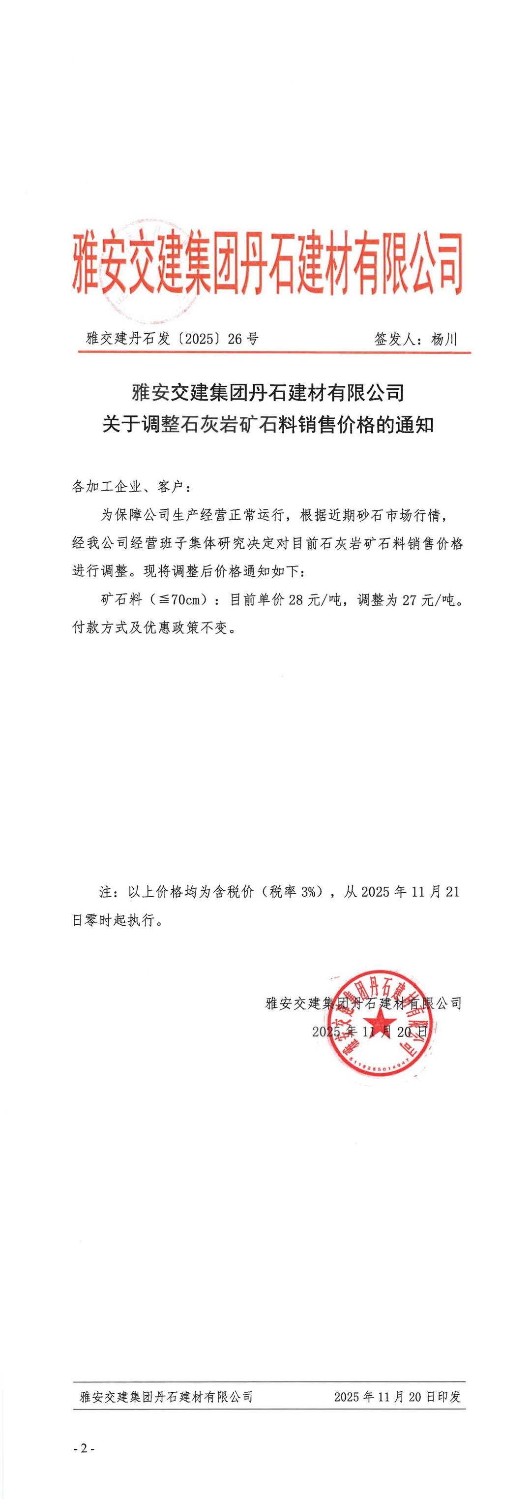 雅安交建集團(tuán)云石建材有限公司關(guān)于調(diào)整石灰?guī)r礦石料銷售價格的通知(2025.11.20)