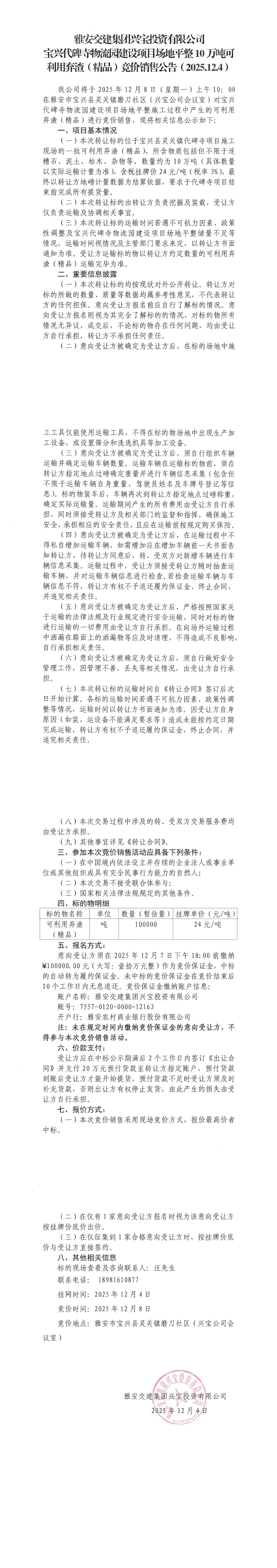 雅安交建集團興寶投資有限公司10萬噸可利用棄渣(精品)競價銷售掛網公告(2025.12.04)